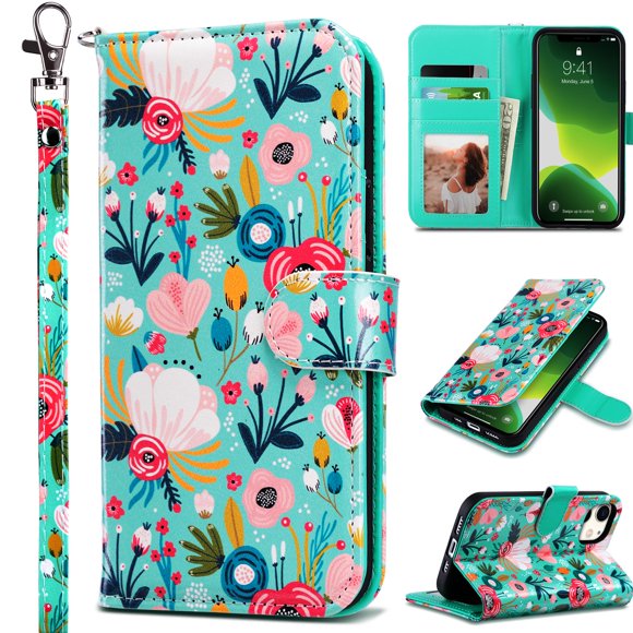 ULAK iPhone 11 Wallet Case for Women Girls, Flip Kickstand Cover with Card Holder Shockproof Phone Case for Apple iPhone 11 6.1 inch, Mint Flora