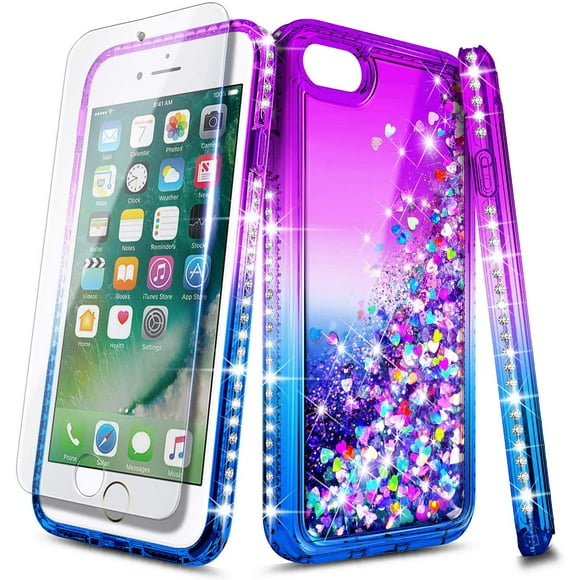 Nagebee Case for iPhone 6S Plus, iPhone 6 Plus with Tempered Glass Screen Protector, Glitter Liquid Waterfall Floating Durable Quicksand Girls Women Kids Cute Phone Case (Purple/Blue)